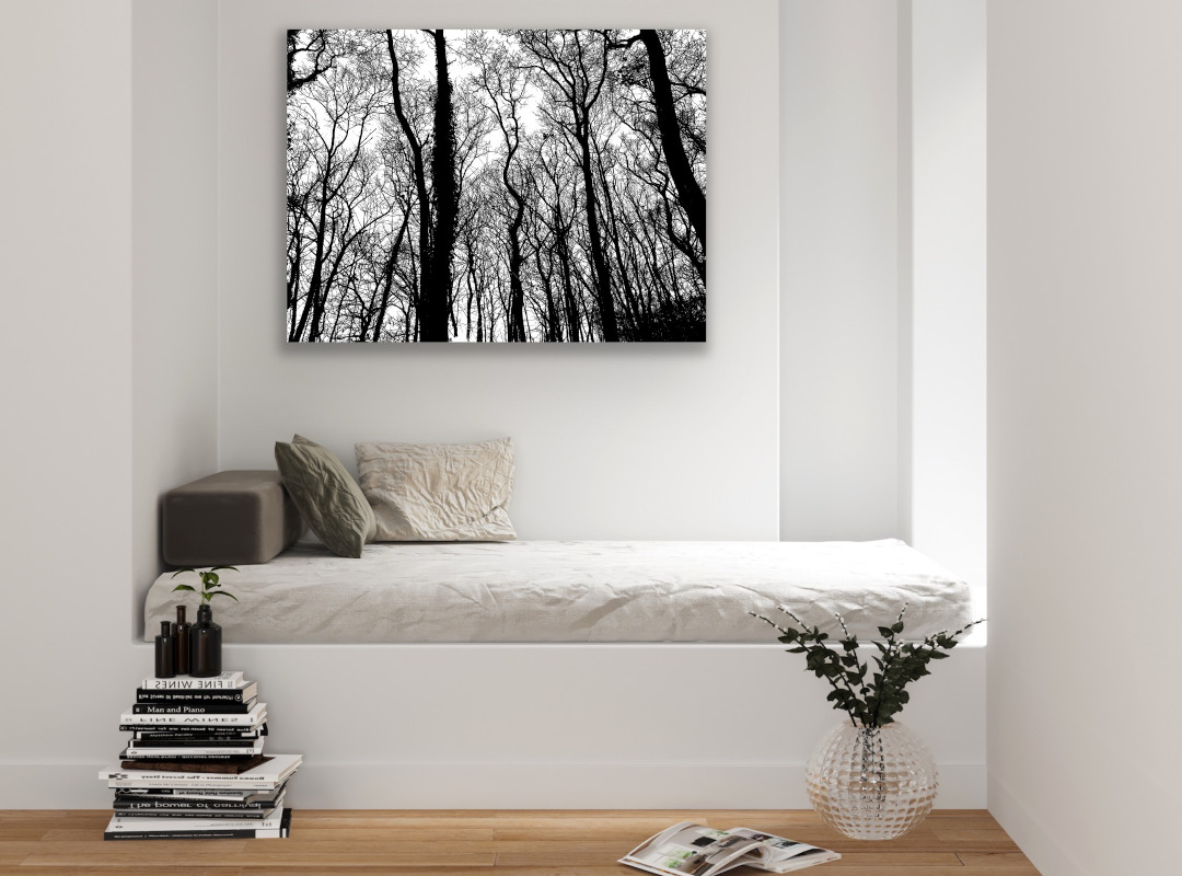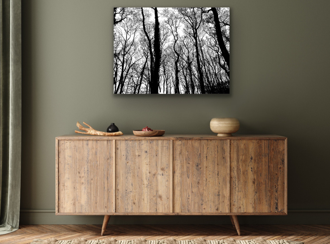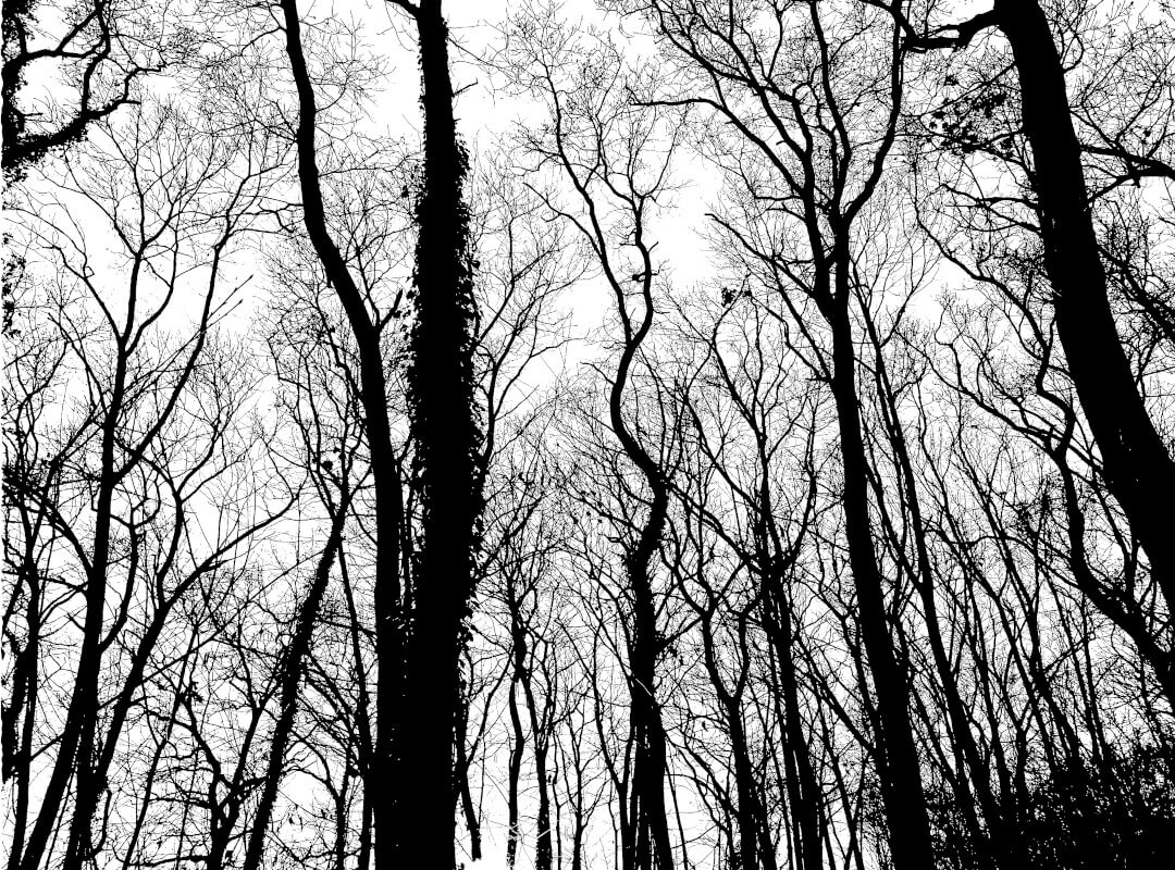 entstand bei einem Spaziergang durch den Pfälzer Wald. Es war still, nur der Wind war leise in den Baumwipfeln zu hören. Der Blick in die Baumkronen – ein Gewirr an Zweigen und feinen Verästelungen. Die dunklen Bäume hoben sich gegen den hellen Himmel ab. Bei der Bearbeitung des Fotos war es mir wichtig, die feinen Strukturen der Zweige noch deutlicher herauszuarbeiten – beinahe wie mit Tusche gemalt.