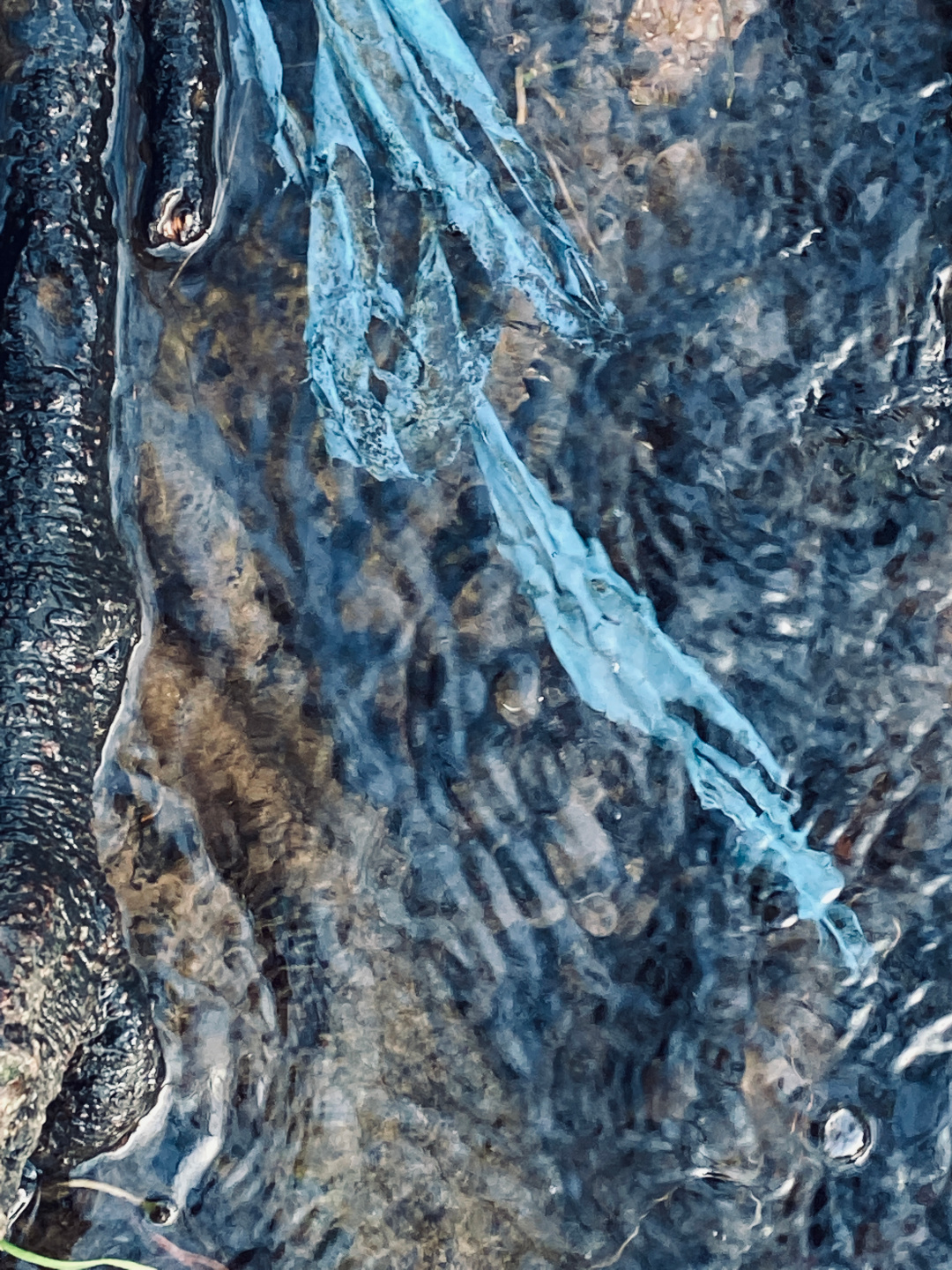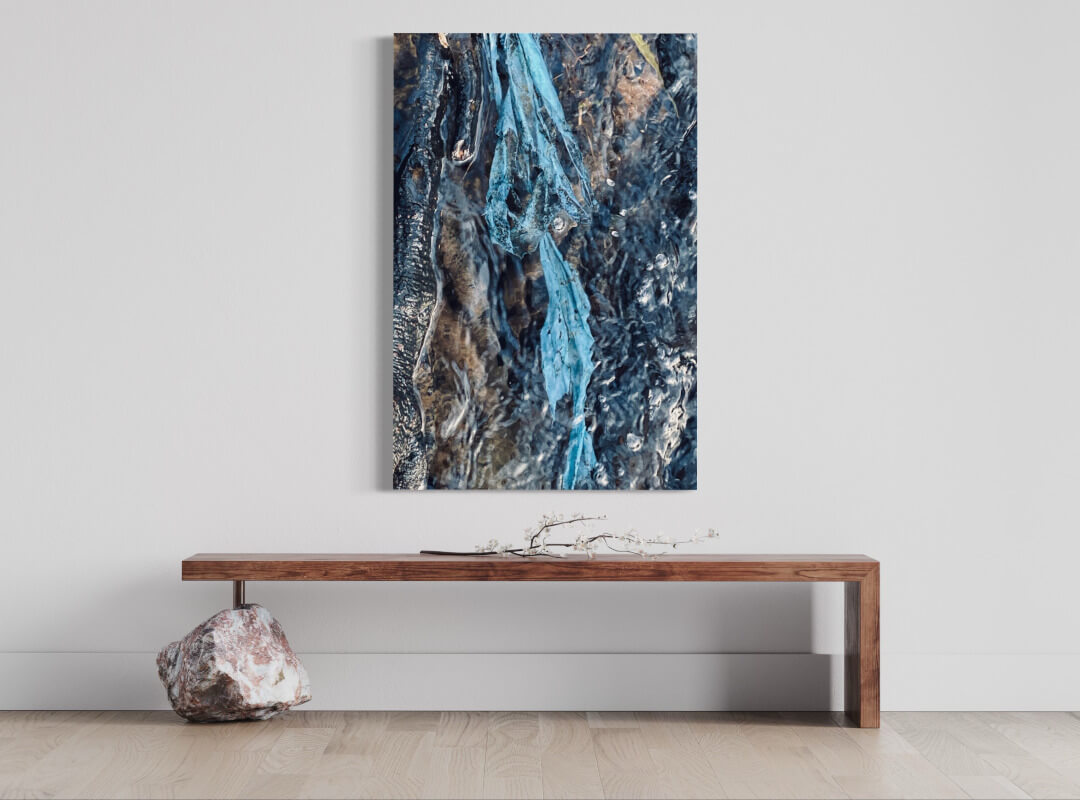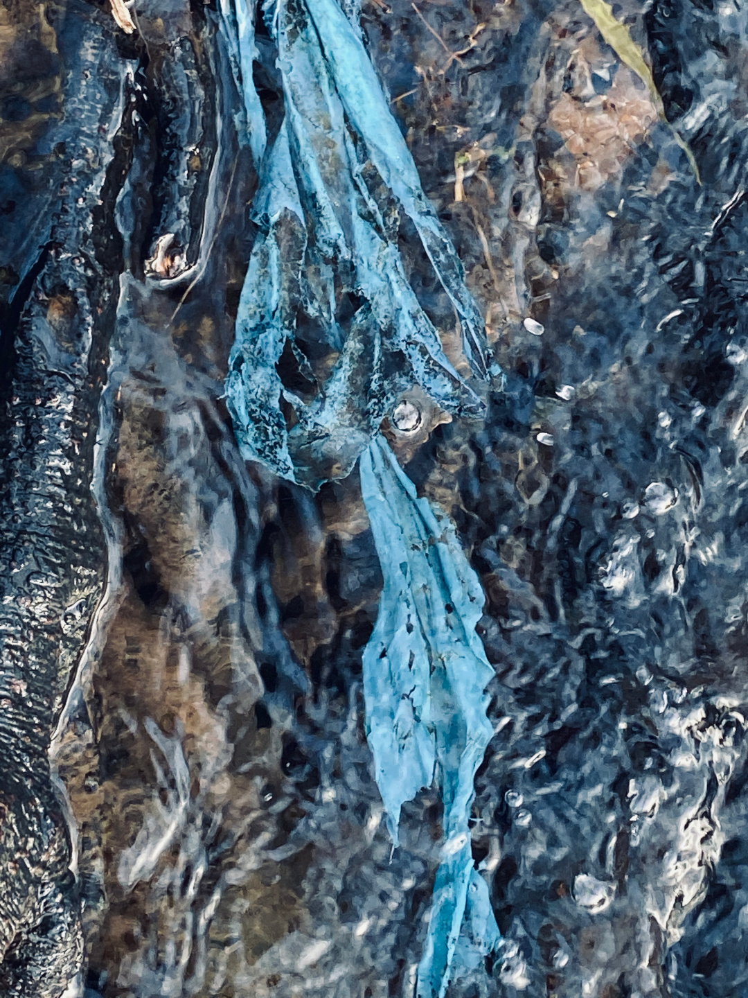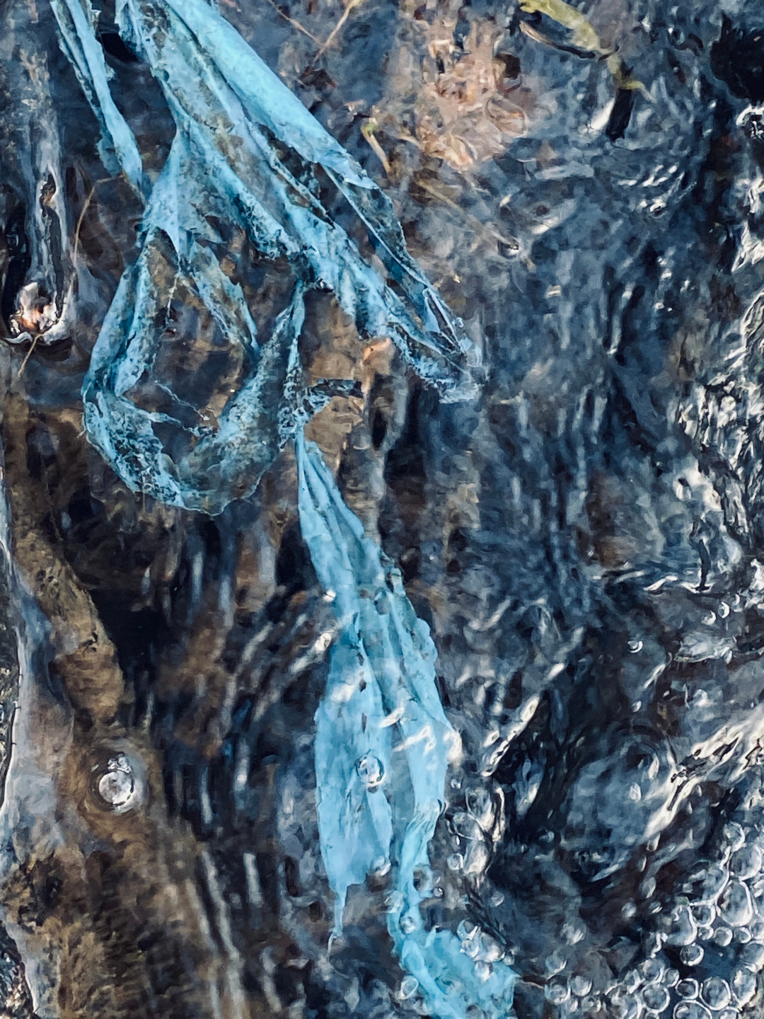 Die Fotoserie „Folie im Wasser“ entstand, als ich mit meiner Tochter und unserer Hündin an der Alb spazieren ging – einem kleinen Flüsschen in der Nähe von Karlsruhe. Wir setzten uns auf die Steine am Ufer und beobachteten das sich kräuselnde Wasser. In diesem Moment fiel mein Blick auf ein Stück blaue Folie, die im Wasser zwischen den Kieseln festhing. Wie die Folie so in der Strömung tänzelte und sich gleichzeitig das Sonnenlicht im Wasser spiegelte – das hatte gleichzeitig etwas anmutiges und mahnendes. Wie schaffen wir es, die Erde zu schützen gegen Verschmutzung und Klimaveränderung? Ein wichtiger Ansatzpunkt: Wir müssen schon unseren Kindern beibringen, respektvoll mit der Umwelt umzugehen. Ich selber habe von meinen Eltern gelernt, meinen Müll nicht in der Gegend herumzuwerfen. Genau dasselbe lebe ich heute meiner Tochter vor.
