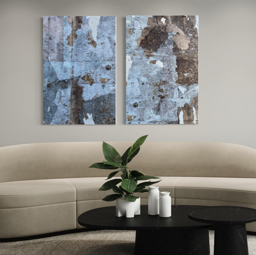 Drei Detailfotografien einer alten Plakatwand in Blau- und Brauntönen in einem Eingangsbereich