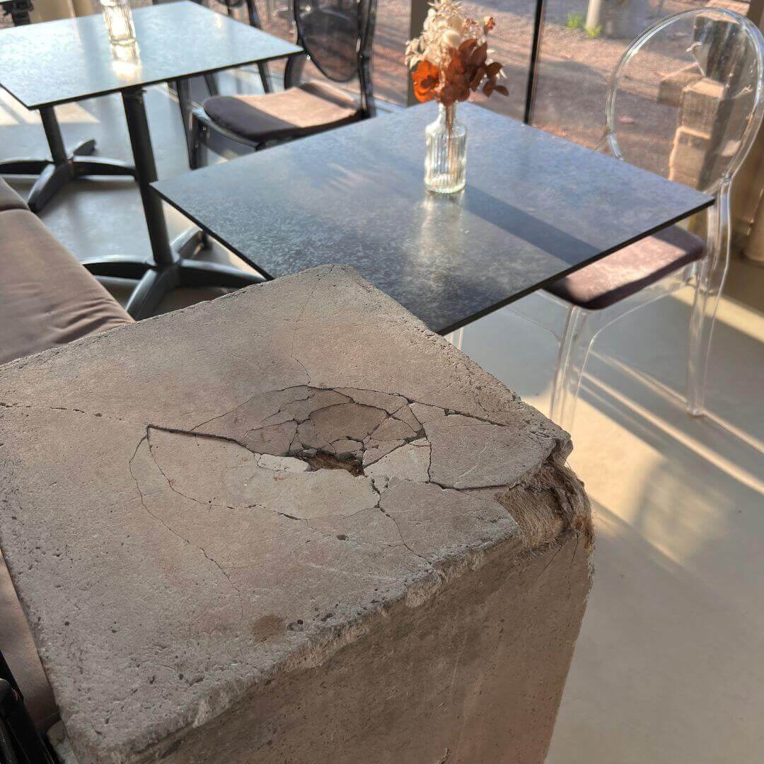 Inmitten auffälliger Café-Dekoration sticht nicht das Verschnörkelte ins Auge, sondern ein schlichter Betonwürfel. Reduziert, roh und klar in seiner Form.